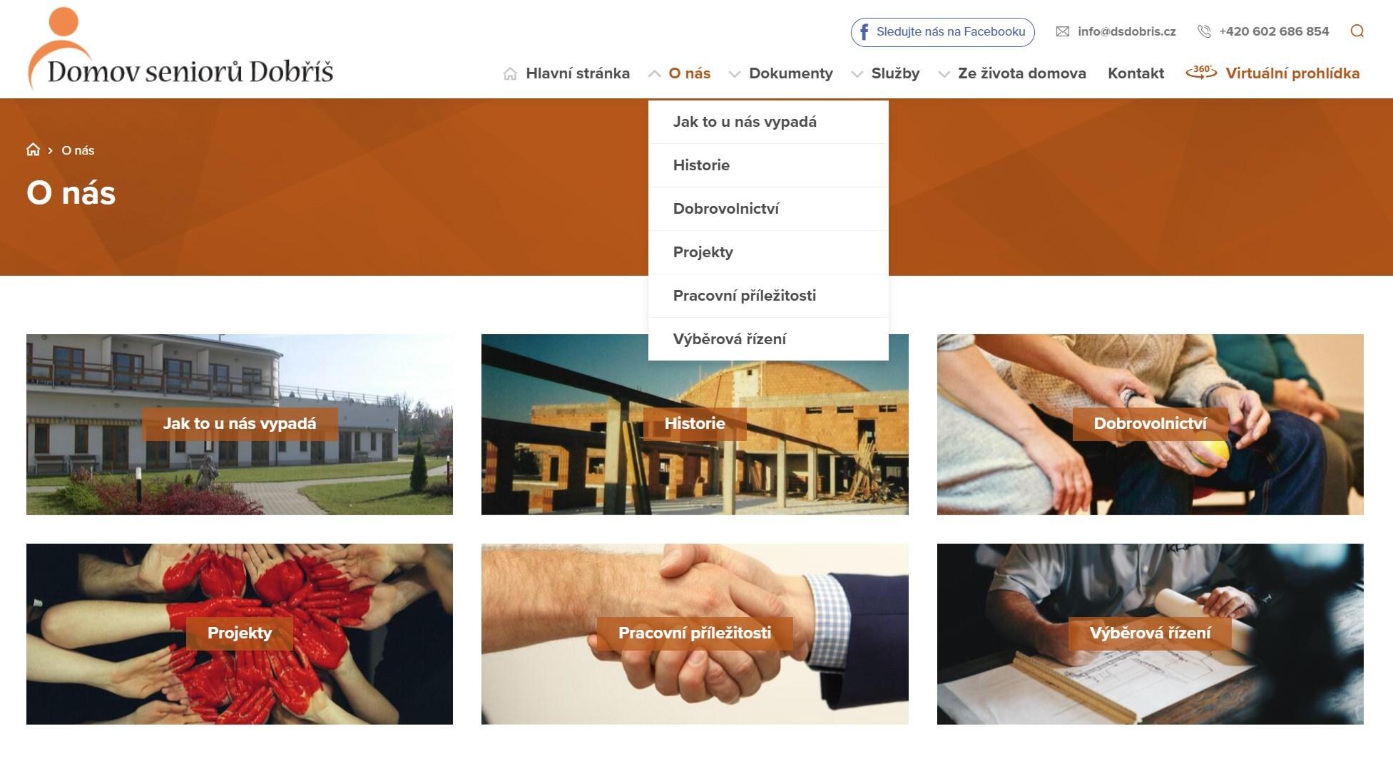 Další velkou sekcí je stránka O nás – místo, kde najde návštěvník všechny informace o organizaci. Může si přečíst, jak zařízení vypadá a kde se nachází, dozví se něco o jeho historii, stáhne si všechny důležité dokumenty a najde zde také pracovní nabídky, tedy které pozice jsou v konkrétním Domově právě volné.